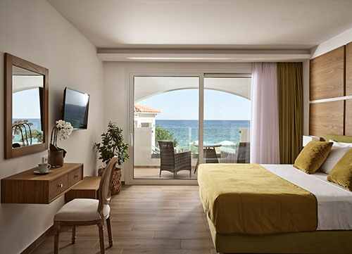The two-storey suites are 40 sq. meters and on the ground floor provide one double bed or two single beds, dressing table, wardrobe, small refrigerator, kettle, coffee maker, hair dryer, air conditioning. satellite TV, Wi Fi, safety box and a private balcony with a view of the sea and the pool.