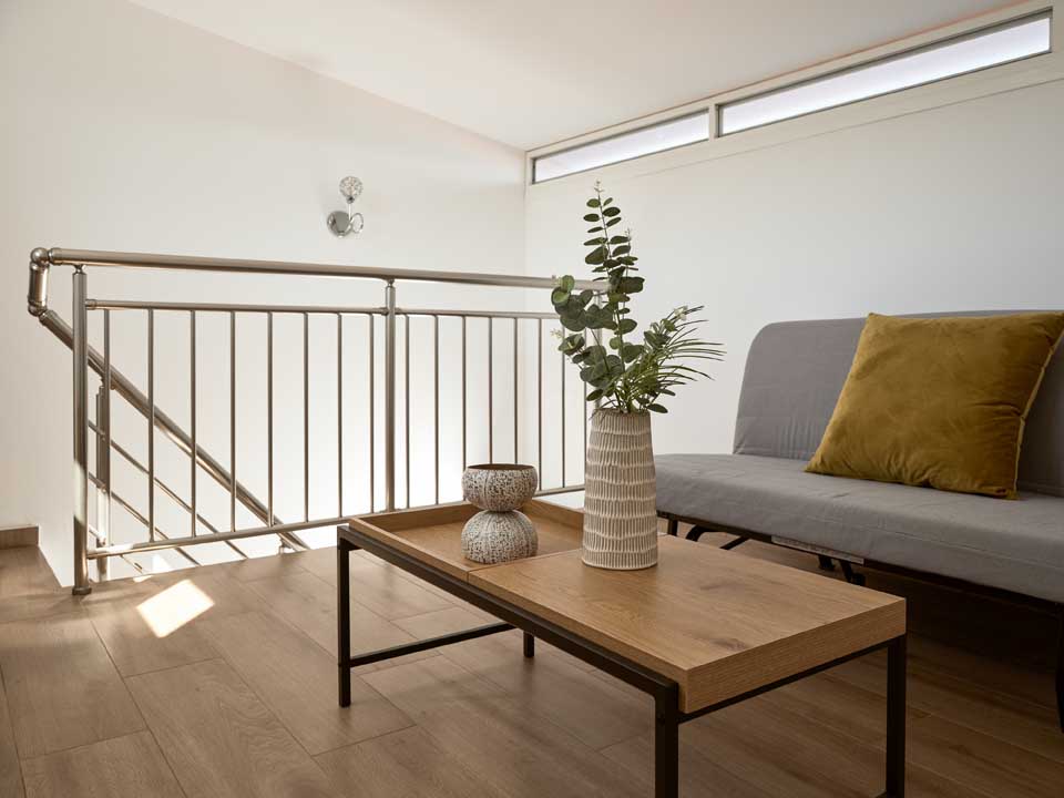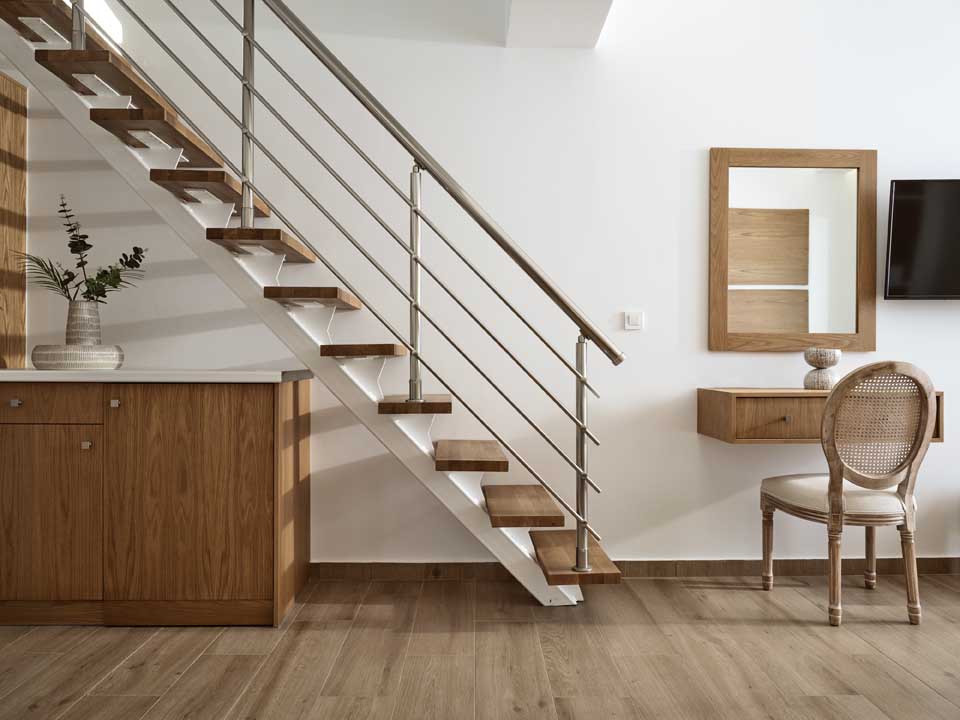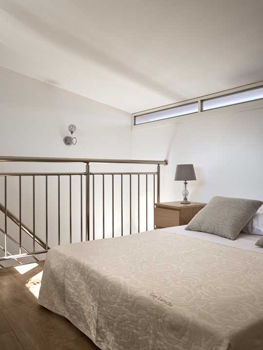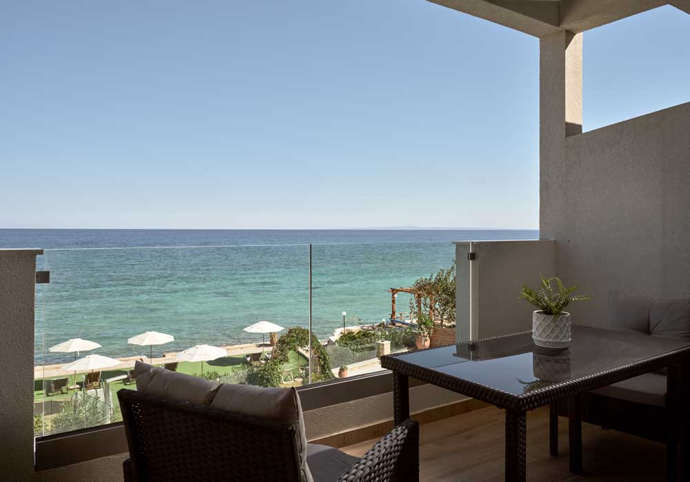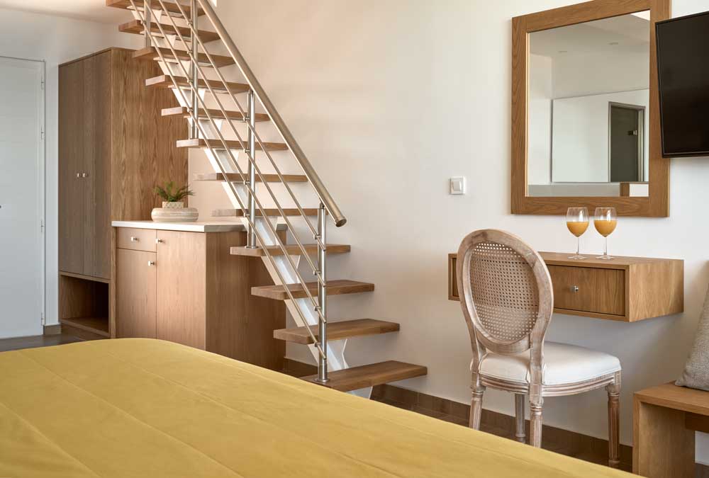 The two-storey suites are 40 sq. meters and on the ground floor provide one double bed or two single beds, dressing table, wardrobe, small refrigerator, kettle, coffee maker, hair dryer, air conditioning. satellite TV, Wi Fi, safety box and a private balcony with a view of the sea and the pool.